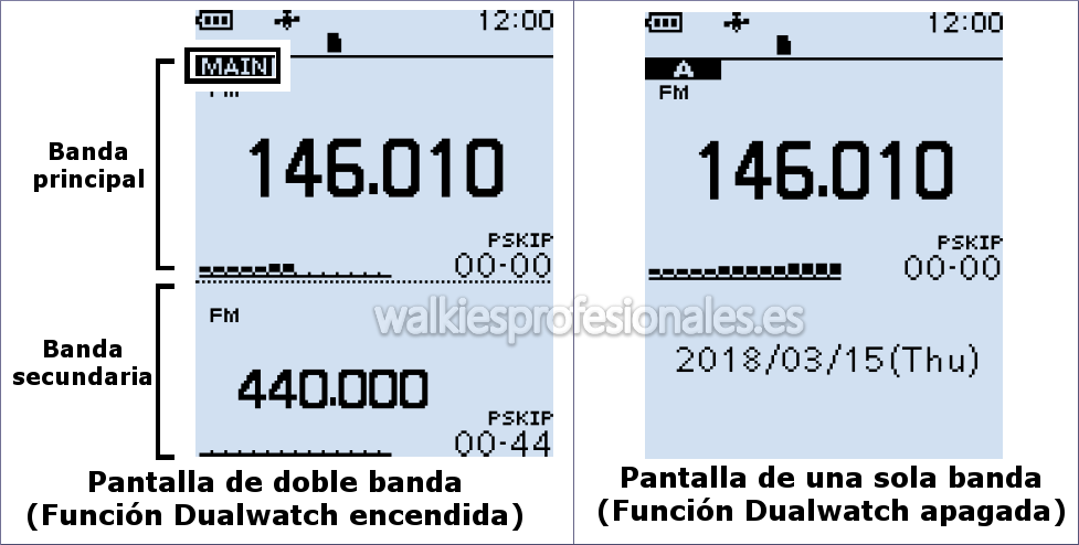 La radio puede recibir en diferentes bandas (función doble vigilancia), por ejemplo señales HF y UHF pueden ser monitoreadas simultáneamente. Puede escanear en busca de otros canales activos en una banda mientras está recibiendo la señal en la banda que está en uso.