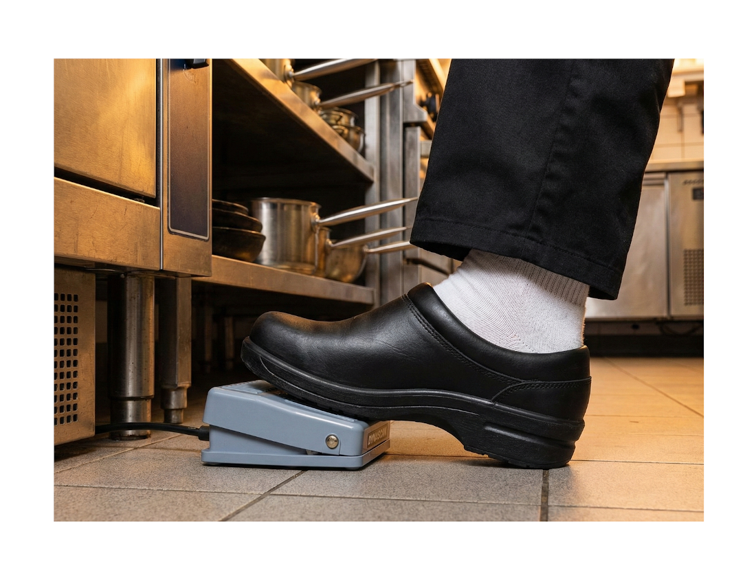 • PTT de pedal externo de pie, robusto y diseñado para uso intensivo en cocina.