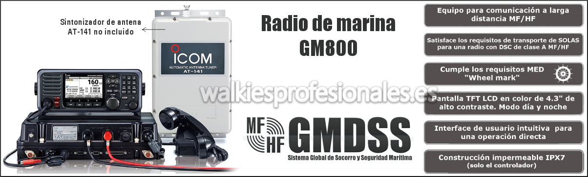 La Emisora ICOM DE MARINA GM800 cumple con los requisitos de radio VHF y MF/HF de GMDSS (Sistema Mundial de Socorro y Seguridad Marítimos) según se requiere para los buques comerciales regulados por SOLAS que realizan viajes internacionales. También cumple con los requisitos MED para los buques mercantes europeos.