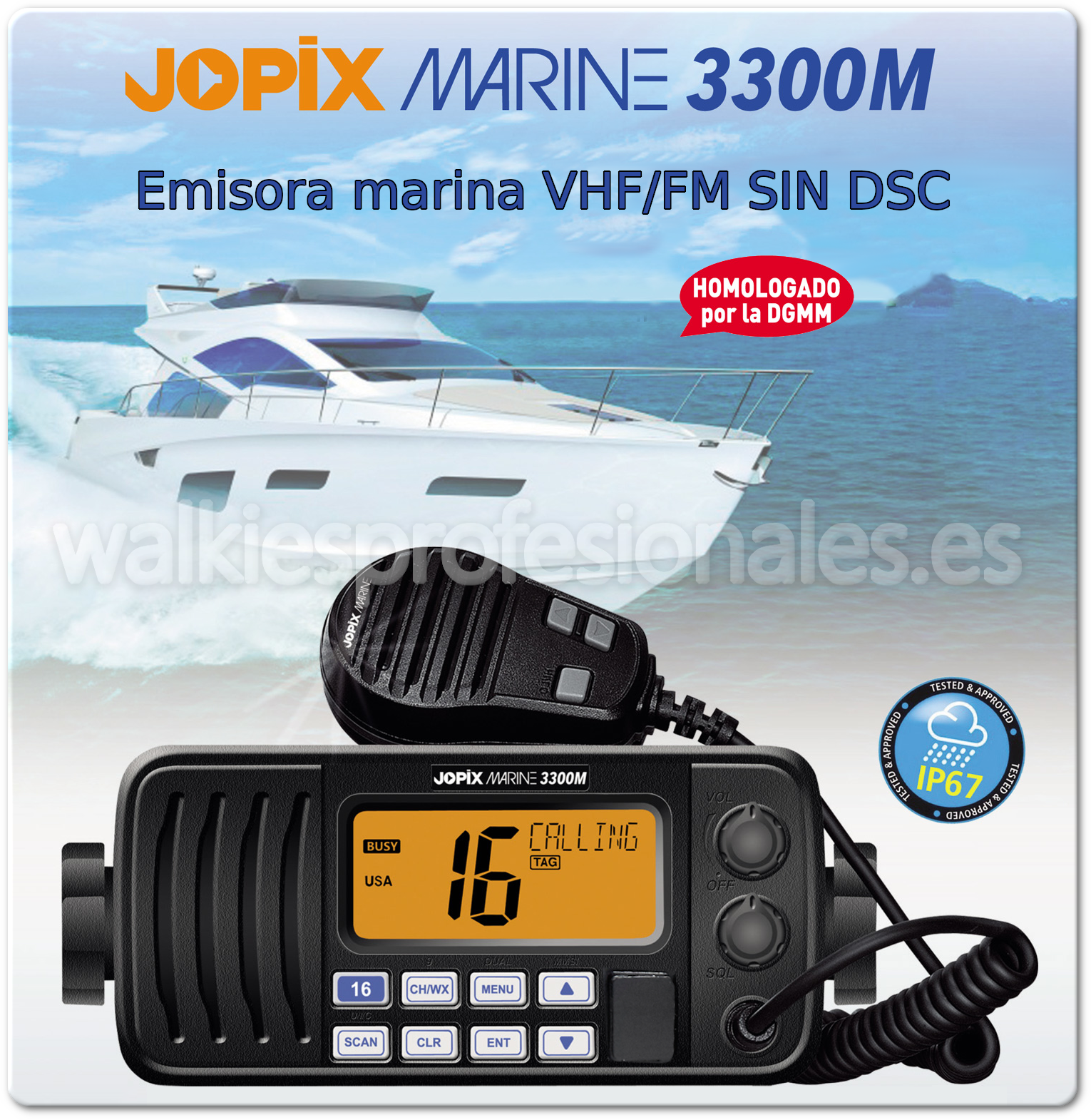 La emisora Jopix Marine 3300M está homologada por la Dirección General de Marina Mercante (DGMM). Es un equipo robusto y resistente, especialmente diseñado para la condiciones marítimas ya que cumple con el grado de protección contra polvo y agua IP67 (sumergible hasta 1 metro de profundidad durante 30 minutos). Esta versión de la emisora NO TIENE DSC.