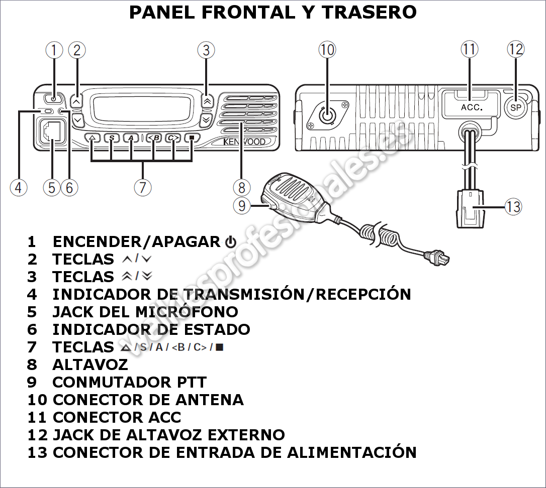 - Conexión de 15-pins para equipamiento externo: entrada de ignición, pulsadores externos, alarma de bocina, micrófono externo, etc. Con cable opcional KCT-60M