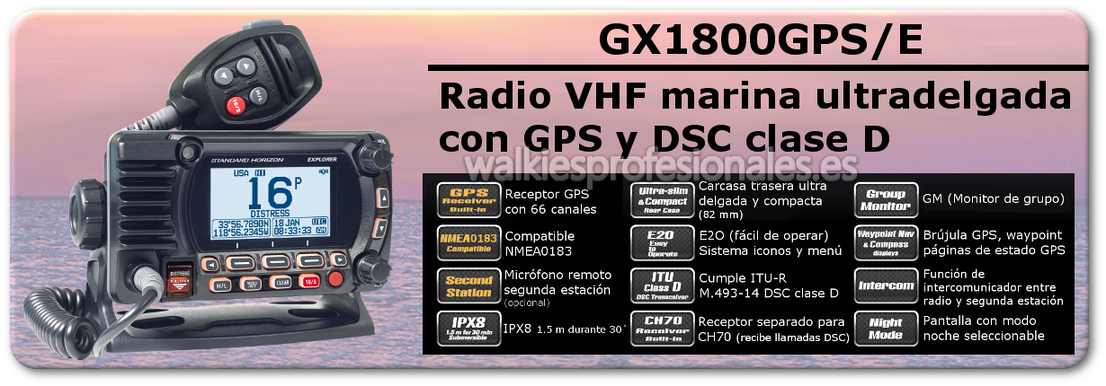 La emisora Standard Horizon de marina GX1800GPS/E incluye un GPS interno de 66 canales en el panel frontal, sin necesidad de cableado de la radio a un GPS para DSC. Asi, las llamadas DSC, el intercambio de posiciones, la navegación de puntos de referencia, la navegación a las llamadas de socorro DSC se pueden realizar fácilmente. También tiene un DSC clase D con un receptor de canal 70 separado, que permite recibir llamadas DSC incluso cuando se escuchan comunicaciones. Cuando está activada la función DSC DISTRESS transmite un MAYDAY digital que incluye identificación de la embarcación, la latitud/longitud y la hora (con GPS conectado), para facilitar una respuesta rápida. Las llamadas adicionales que se pueden hacer son Individual, Urgencia, Seguridad, Informe de posición y Enviar.