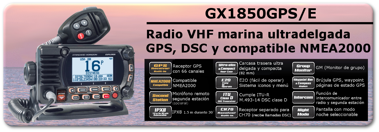 La emisora Standard Horizon de marina GX1850GPS/E incluye un GPS interno de 66 canales en el panel frontal, sin necesidad de cableado de la radio a un GPS para DSC. Asi, las llamadas DSC, el intercambio de posiciones, la navegación de puntos de referencia, la navegación a las llamadas de socorro DSC se pueden realizar fácilmente. También tiene un DSC clase D con un receptor de canal 70 separado, que permite recibir llamadas DSC incluso cuando se escuchan comunicaciones. Cuando está activada la función DSC DISTRESS transmite un MAYDAY digital que incluye identificación de la embarcación, la latitud/longitud y la hora (con GPS conectado), para facilitar una respuesta rápida. Las llamadas adicionales que se pueden hacer son Individual, Urgencia, Seguridad, Informe de posición y Enviar. Además es compatible con NMEA2000.