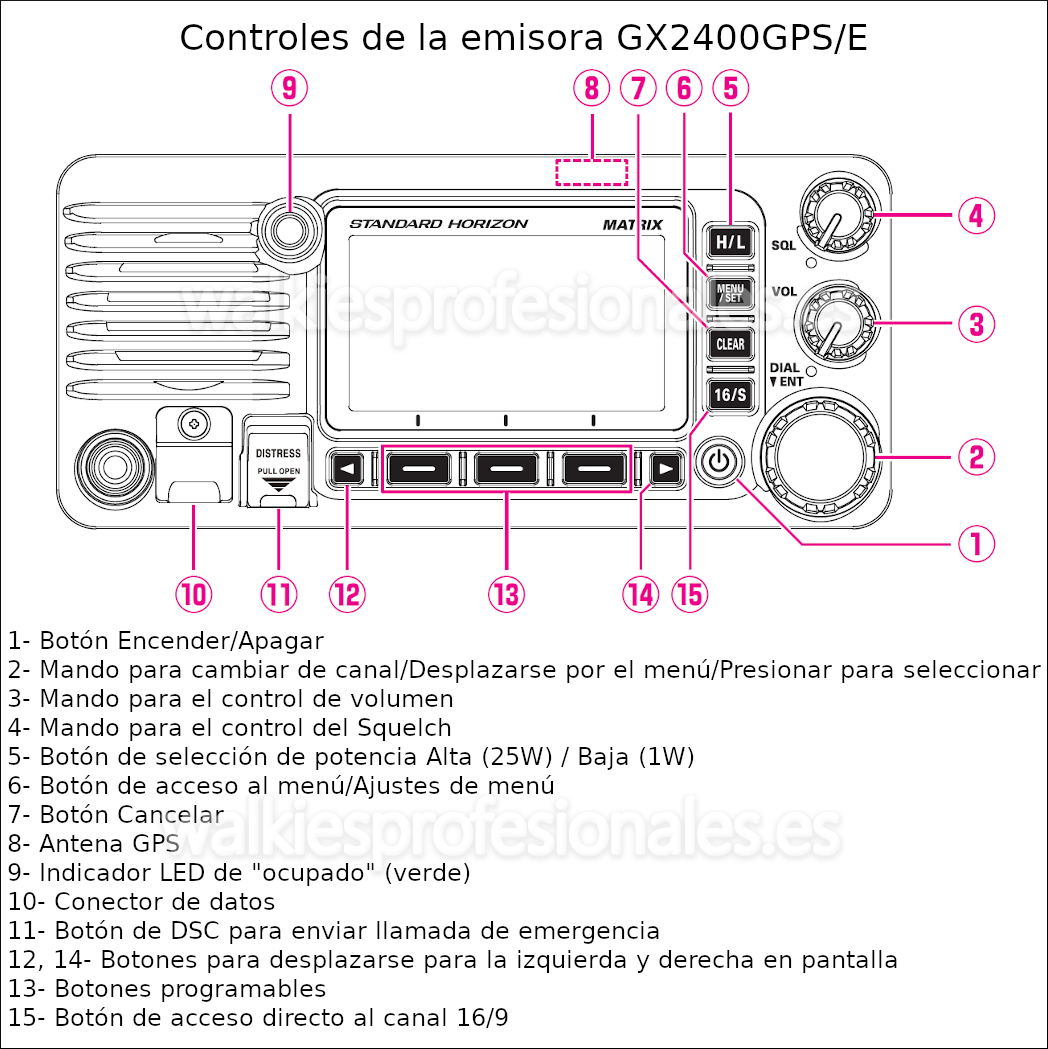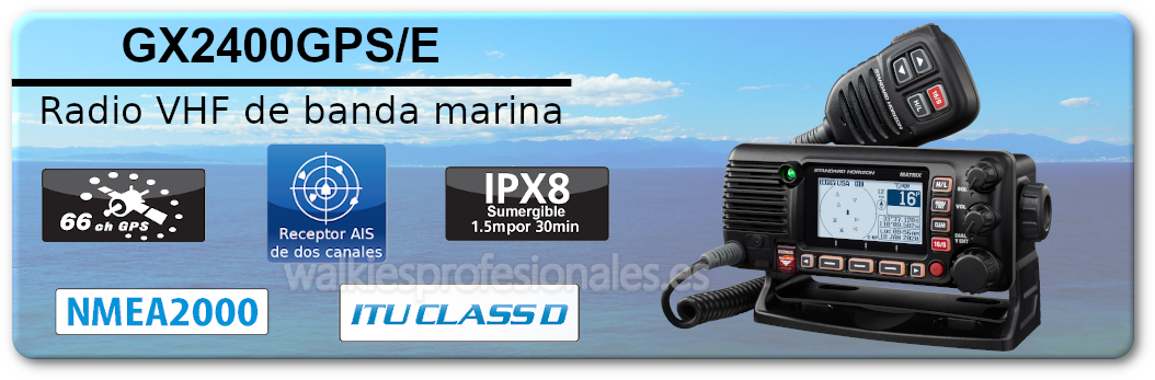 La emisora STANDARD HORIZON DE MARINA GX2400GPS/E tiene un receptor GPS integrado de 66 canales que facilita las llamadas DSC o AIS. También tiene receptor AIS de dos canales incorporado. Esta radio es muy fácil de manejar gracias a su sistema de menús e iconos E2O y viene lista de fábrica para ser usada. La adquisición de objetivos AIS, llamadas DSC, uso compartido de posición, navegación de punto de ruta (waypoint) y navegación a llamadas de socorro DSC se pueden realizar con solo unos sencillos pasos.