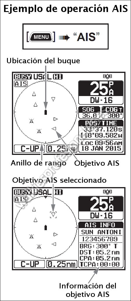 Receptor AIS de doble canal- Visualización de objetivo AIS/AIS SART: MMSI, indicativo de llamada, nombre del barco, BRG, DST, SOG y COG.