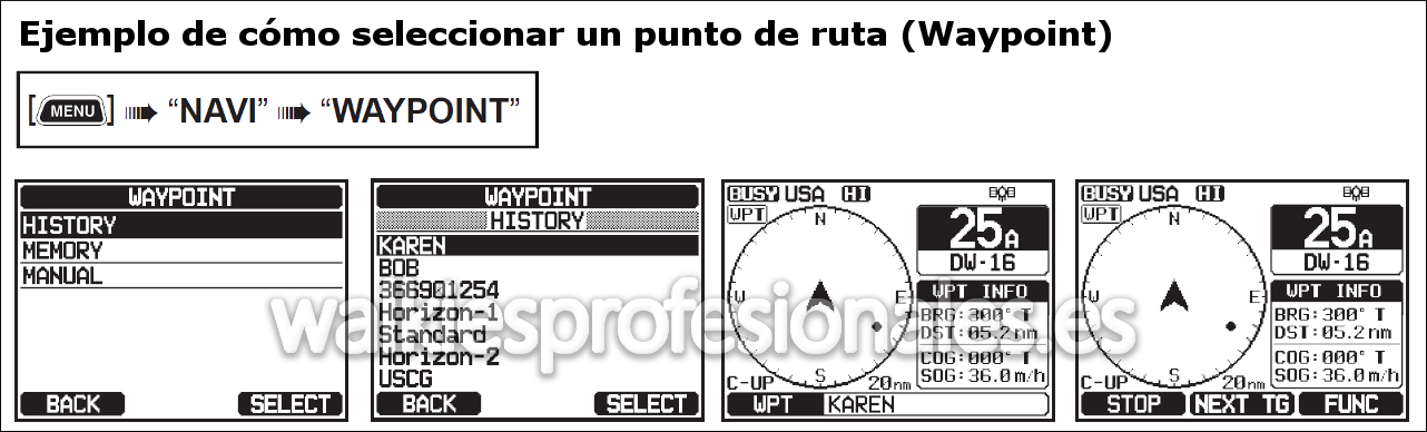 Esta radio es capaz de ingresar y guardar hasta 250 puntos de ruta (Waypoints), para la navegación usando la página de la brújula. También puede navegar a llamadas de socorro DSC con una posición recibida de otra radio utilizando sondeo DSC.