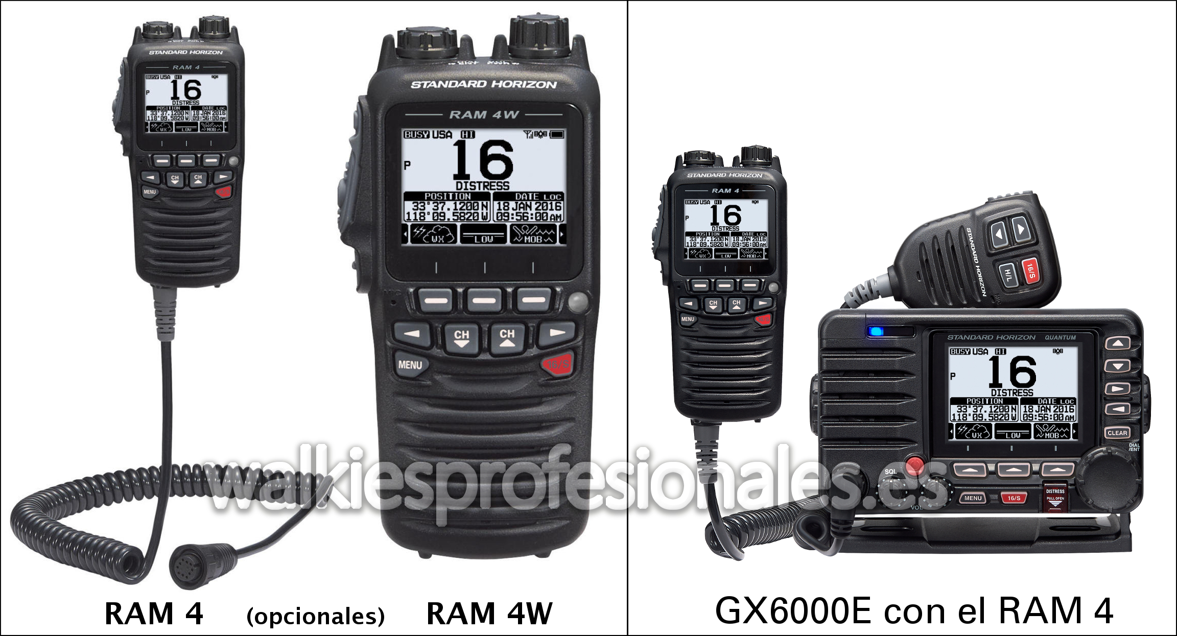 Es posible controlar todas las funciones del equipo GX6000E con la interfaz del micrófono de acceso remoto RAM 4 (no incluido) con cable o de forma inalámbrica con el RAM 4W (no incluido). En el caso del RAM 4 podemos conectar hasta 2 micrófonos remotos. Con el RAM 4W, usando el punto de acceso inalámbrico SCU-30 (no incluido) conectado a la parte posterior de la radio, tiene la capacidad de sincronizar hasta 4 unidadades RAM 4W. Con un rango operativo de hasta 18 m, esta estación le permite controlar todas las funciones de la radio, incluidas llamadas DSC, sondeo de posición, llamadas grupales y más. También se puede usar la estación para intercomunicar con la estación principal o entre otras unidades inalámbricas RAM 4W.