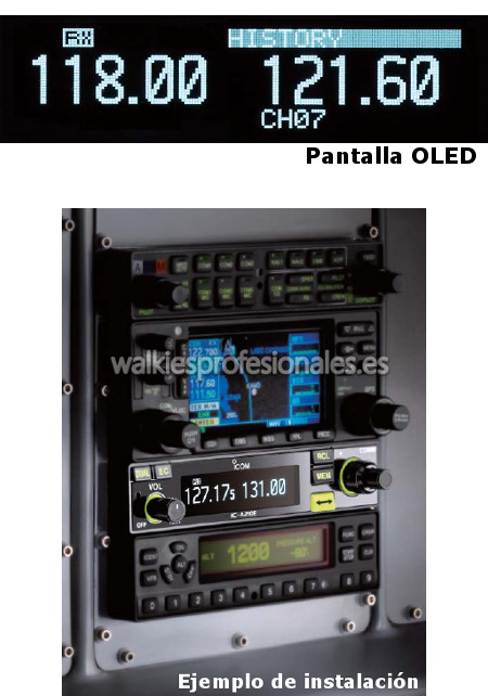 La emisora ICOM IC-A210E de banda aérea destaca por su gran pantalla OLED que contiene un diodo emisor de luz orgánico que emite luz por si mismo ofreciendo muchas ventajas. Entre ellas nos aporta brillo, intensidad, alto contraste, un amplio ángulo de visión y tiempo de respuesta, características que hacen de esta pantalla mucho mejor si la comparamos con una pantalla convencional. Además incorpora la función de atenuación automática para adaptarse a las diferentes condiciones de luz tanto de día como de noche.