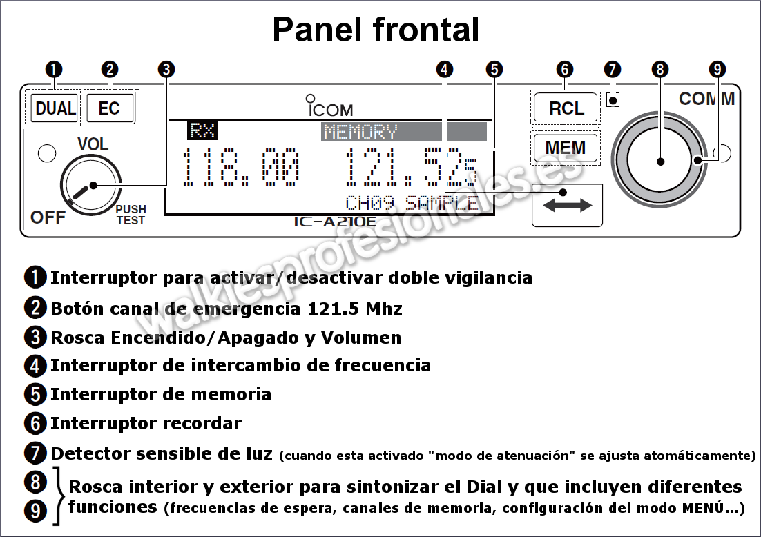 • Frecuencia de radio IC-A210E: 118.000-136.975 Mhz