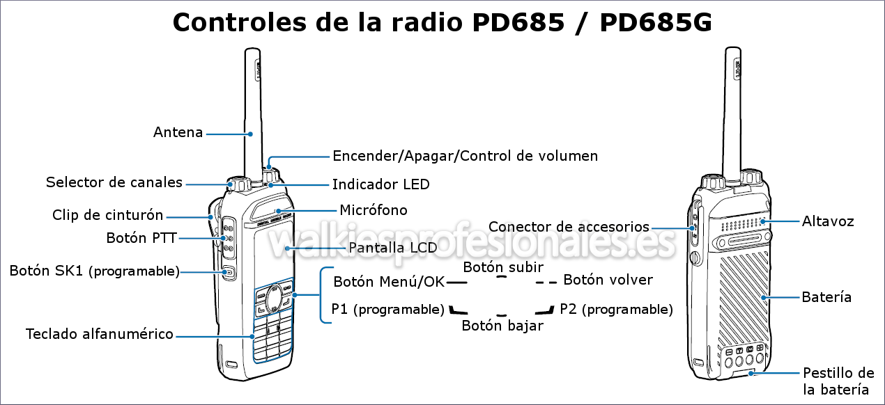 - PD685V VHF: 136-174 Mhz, sin GPS y sin la función Hombre caído