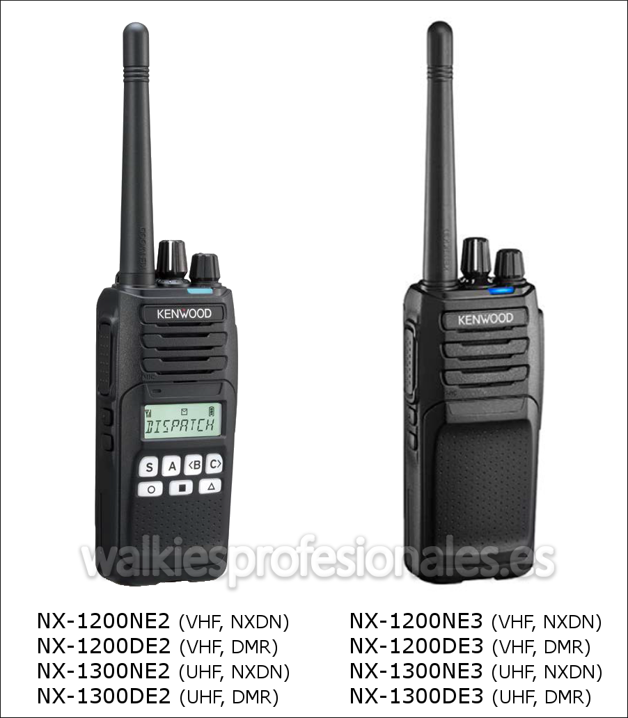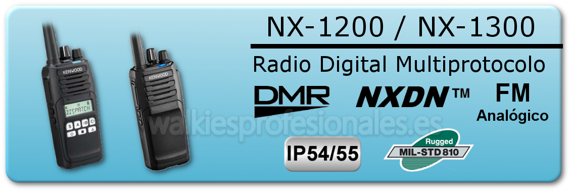 El Walkie Kenwood Digital NX-1200 / NX-1300 es una radio multiprotocolo diseñada para operar en modo mixto bajo los sistemas NXDN o DMR y FM analógico. Esto permite una migración progresiva y a su propio ritmo de analógico a digital. Dentro de este modelo Kenwood nos ofrece dos opciones; uno de ellos es básico, sin pantalla ni teclado; el otro incorpora una pantalla LCD de 8 dígitos retroiluminada de alto contraste y un teclado de 7 botones. Ambos tienen un diseño robusto y resistente ya que cumplen con el grado de protección contra polvo y agua IP54/55 y con las normas MIL STD-G.